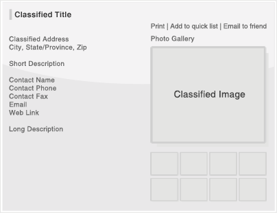 • Title, Address, Photo, Contact Name, Contact Phone, Contact Fax, E-mail Link to Contact Form, Print Option, Web Site Link, Summary Description, Detail Description, Photo Gallery (7 Additional Photos), Google Map.