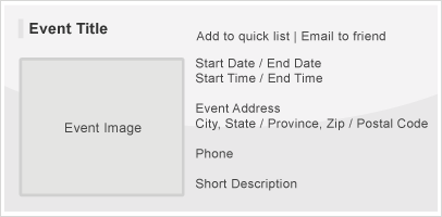 • Title, Date, Time, Event Image, Address, Phone, Summary Description.