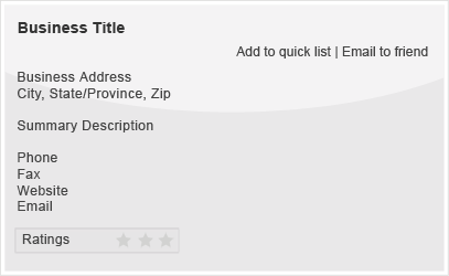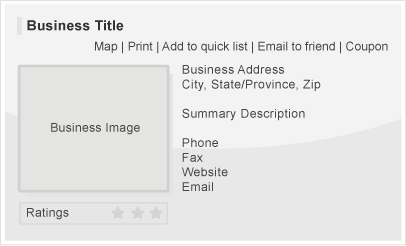 • Title, Address, Phone, Fax, Web Site Link, Convenient E-Mail Form Link, Summary Description, Add to Favorites, Send to a Friend, Ratings and Reviews.