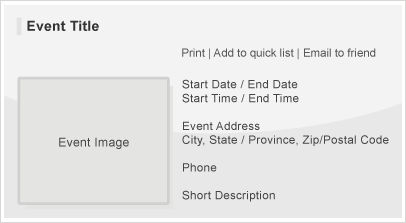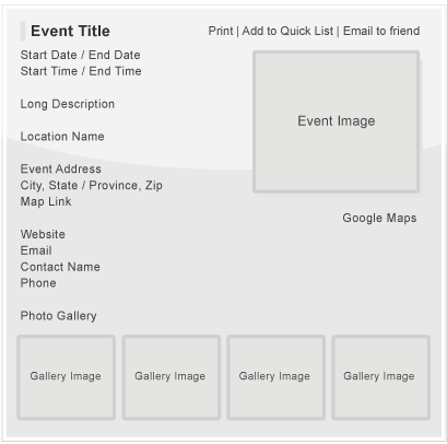 • Title, Date, Time, Event Image, Address, Location, Summary Description, Driving Directions, Phone, Web Link, E-mail Address, Print, Contact Name, 3 Image Photo Gallery, Long Detail Description, Google Map.