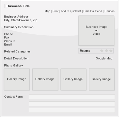 • Title, Logo Image, Address, Phone, Fax, Web Site Link, Contact Form, Summary Description, Detail Description, Send to a Friend, Add to Favorites, Google Map, Print, Coupon, Ratings and Reviews, 4 Image Photo Gallery, Contact Form, Video Snippet Link Option, File Attachments (PDF's, User Manuals, Word Docs, etc), Business Hours, Locations, Service Listings.
